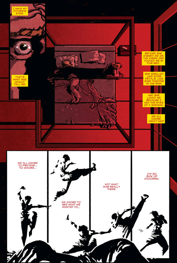 Another first issue from Marvel, this time Kaare Andrews channels his inner Steranko and writes, draws, and colors, with letters from Joe Caramagna. It’s not often you see a Big 2 book with a credits box this small, and this book feels different. Starting with Danny Rand recounting the family trip that ended in tragedy and put him on his path to becoming Iron Fist to a reporter. Danny seems lost in his own personal hell, just drifting by, even when bedding the reporter. Interspersed are more flashbacks of his fathers death, and apparent only at the end of his life, insanity. Things seem bleak for Danny, so when he leaps through the window, you are left with a great page turn. Ninjas! Tons and tons o’ ninjas dangling from helicopters. After Fisting destroying a helicopter or two and dispatching the ninjas, he makes his way back to his bedroom, where his lady friend whose name he can never get right is in the grasp of an undead cyborg ninja. A little malfunction of his powers and he is able to take him down after getting his chi focused again. Behind him there is movement, not another ninja, but a girl, telling him to get back home to Kun Lun.