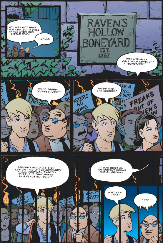 Michael Paris is on his way to Raven’s Hollow, his grandfather passed away and left him some property, all he wants to do, is sign it over to the town council and head back home. It’s pretty clear though, things aren’t going to be quite that easy. He enters town to an actual torch-wielding mob, and finds out that the property he was left, is a cemetery, the Boneyard that gives the series it’s name. The mob, led by the Mayor is on the way to destroy the cemetery. The two gargoyles guarding the gate can talk, before Paris can even process this, he is met by a beautiful woman. She asks him not to sign anything until he gets a chance to hear “our side,” and we get our first look at the rest of the denizens of the Boneyard.