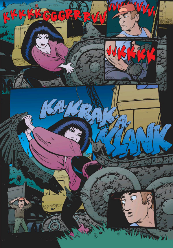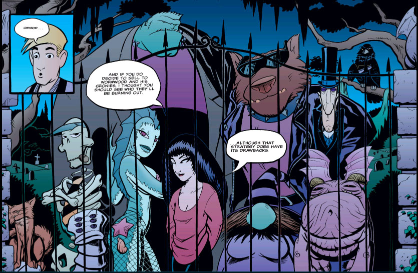 The speeding car is close to backing over Abbey who vaults over the car taking a piece of it with her, topless, due to Paris accidentally pulling her top off when trying to drag her out of the road, though to be fair, in the grand comic book tradition, nothing can be seen. They make it back to the Boneyard, Micheal is introduced to Leon and Boris, the gargoyles at the gate of the cemetery, and Micheal and Abbey formally introduce themselves to each other. They make their way to the guys playing cards and Paris is introduced to them, with Paris asked to join and declining due to a trauma involving strip poker. They continue with the tour, meeting Nightcrawler, the talking, worm thingie, Hildy the witch, who is attempting to cook Glump the demon, for using her cauldron as a hot tub. Last but not least, Nessie the busty fish lady, and her husband Brutus, the enormous Frankenstein monster. Nessie makes her first of many to come, uncomfortable passes at Paris. Followed by the first of the, Paris and Abbey, are maybe going to kiss and are interrupted. Ralph and Sid decide to walk Paris home and next thing we see is inside the Dark Corner, some sort of supernatural bar, with Ralph and Sid instigating a fight between Paris and some kind of big monster.