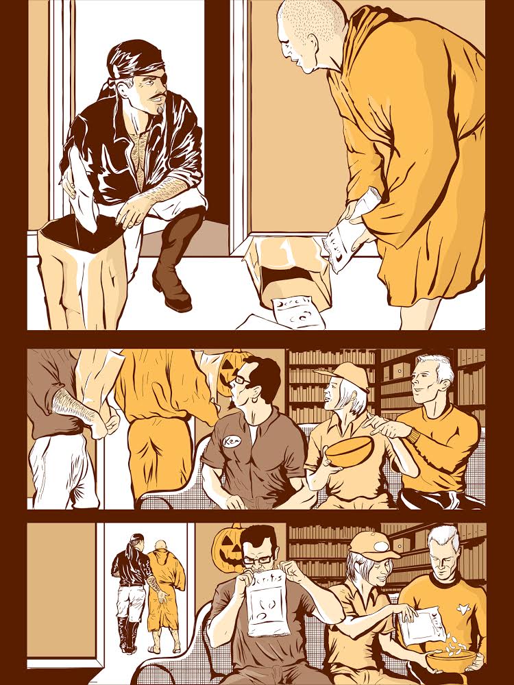 DL: I find the distinction’s one of “porn is not respectable/erotica is respectable”. I find this distinction problematic so I gently avoid it by labelling our work “smart, wholesome gay comics smut.” The quality of the work speaks for itself so I don’t feel I have to “upscale” it with a respectability label.