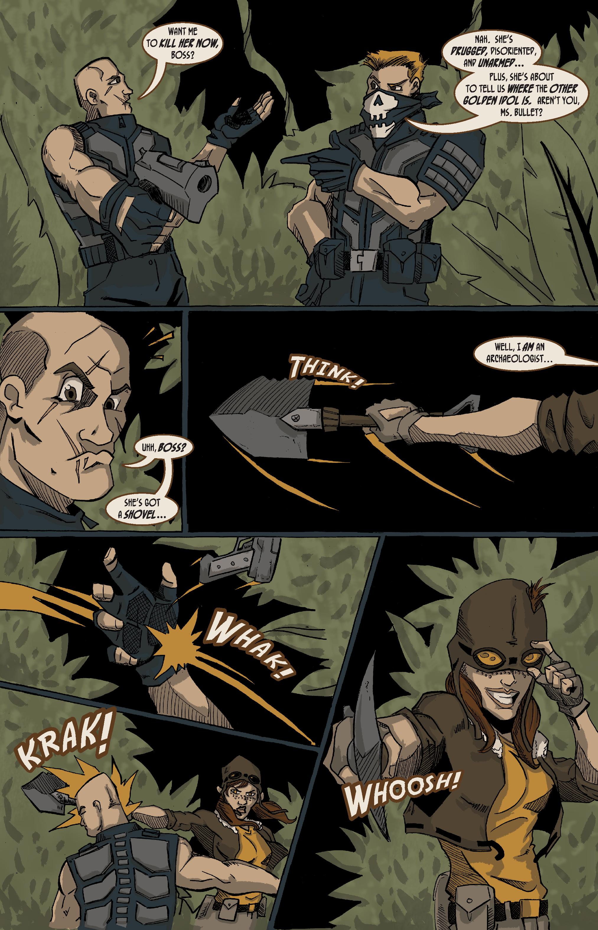 Next we have a section with youngest Bullet sibling Kelly Bullet, with art by Jason Jimenez. Kelly is the archaeological adventurer of the group, and Jimenez nails the pulpy, fun, adventure tone of her story. All of the LeFun of Indiana Jones, with none of the LeBeouf.