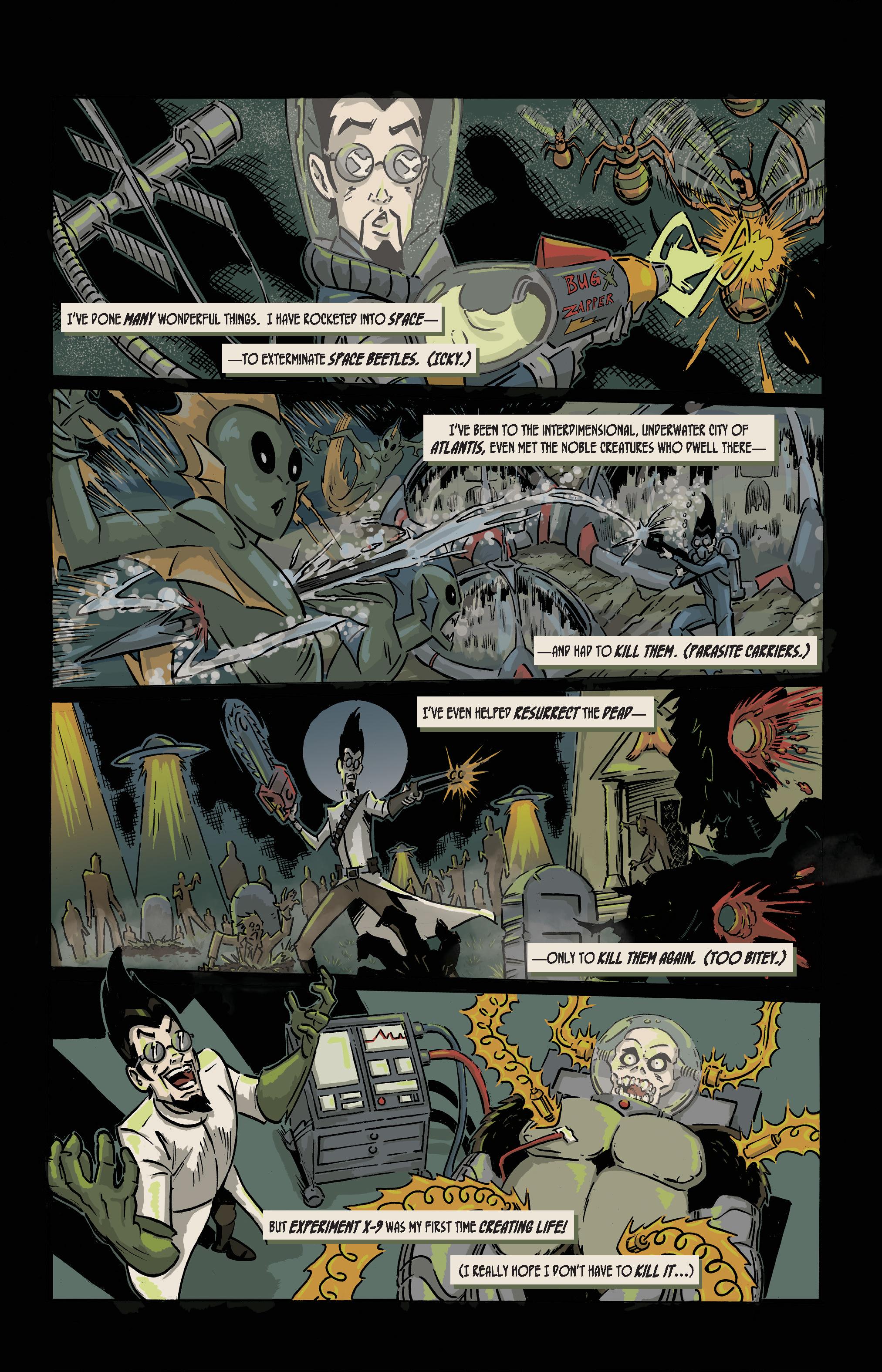 Next up is mad scientist, and recipient of the Wayne Static Award For Excellence In Vertical Hair (I might’ve made that last part up) Archie Bullet, with art by Stephen Sharar. This section so lovingly embraces so much of the retro, pop, sci-fi stuff that floats my gravy boat, I want more. Actually I want more of the Bullets period