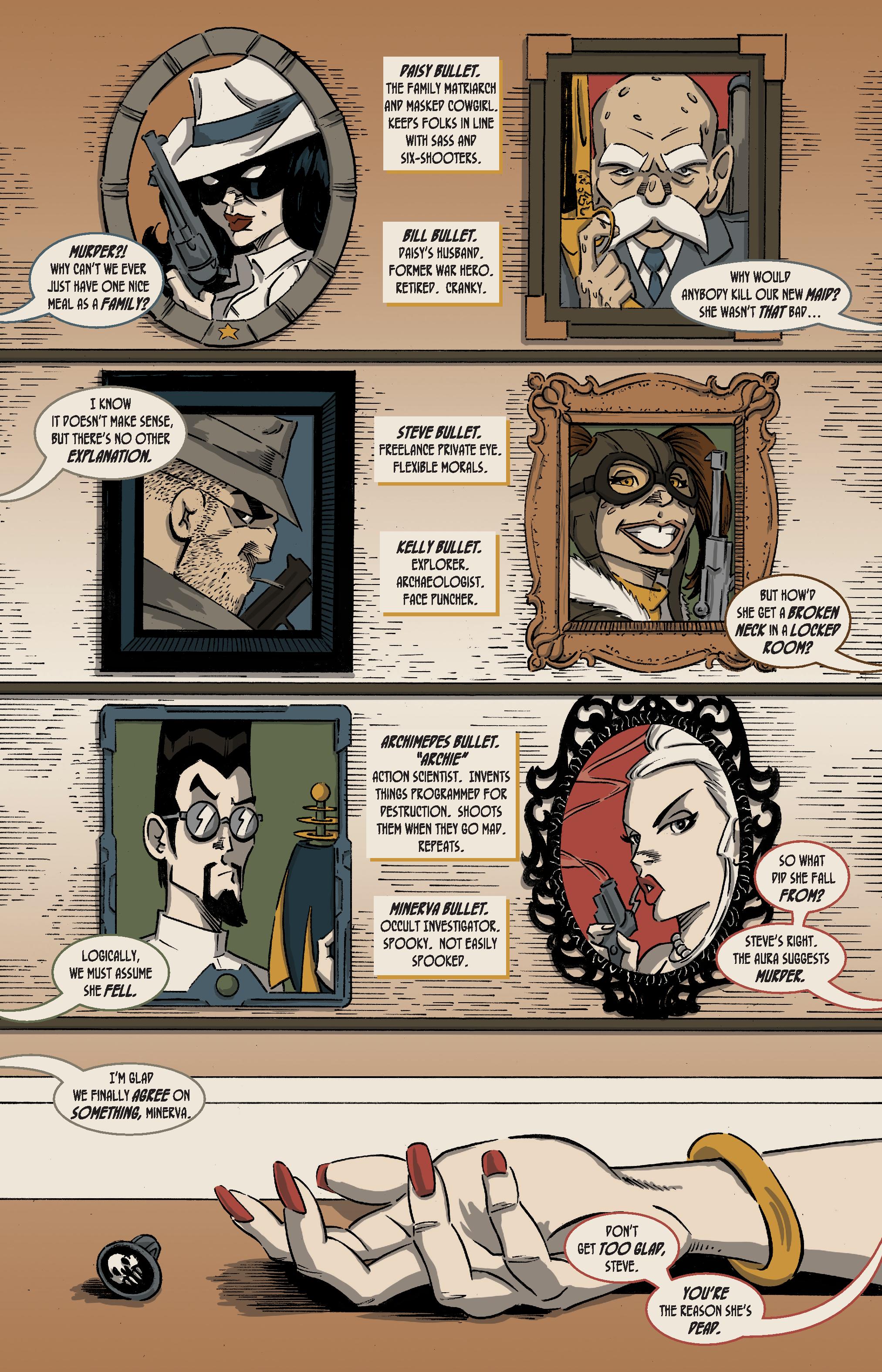 Wild Bullets focuses on the Bullet family, parents Daisy and Bill, and their children, each one a pulpy adventure hero in their own right, gathering for a family Thanksgiving, that becomes a locked room murder mystery.