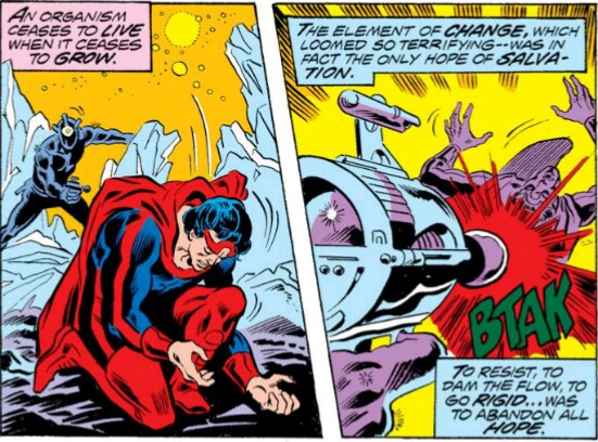 The story opens on an alien world with titular (Hee-hee!) Omega fleeing some sort of robotic, humanoid creatures and descriptions of what is going on in the mind of Omega. If there is one thing I want to highlight as a takeaway from this issue right off the top it is the captions of a couple panels on page 3. “AN ORGANISM CEASES TO LIVE WHEN IT CEASES TO GROW. THE ELEMENT OF CHANGE, WHICH LOOMED SO TERRIFYING—WAS IN FACT THE ONLY HOPE OF SALVATION. TO RESIST, TO DAM THE FLOW, TO GO RIGID…WAS TO ABANDON ALL HOPE.” Put that in your pipe and smoke it, hell, take it to the frat-house and let Chad. Fat Gary, and Black Steve (Apologies to Vince from Filmdrunk) pour it in the funnel so you can butt-chug it, bro! In all seriousness though, that is good stuff, as someone who was trapped in a pretty deep, self-destructive hole that was based really, in fear, things like that can just stick in your head. Change is fucking scary, it’s not an easy thing to face sometimes. But change leads to growth, to strength you never knew you possessed, and the fear of change can lead to death. And there it was right there in a funny-book, words to live by.