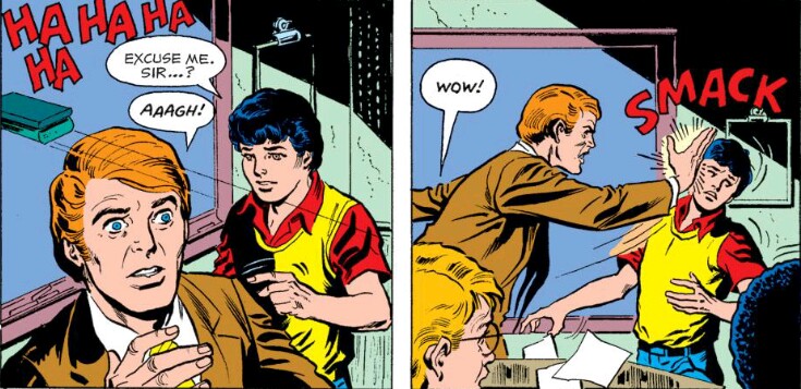 Backhanded by his teacher. Damn. That’s cold shit. He does make friends though with some other kids at the school, the nerdy, uncool kids, and runs afoul of the school bullies. Just when his day is over and he can finally get the hell out of there.