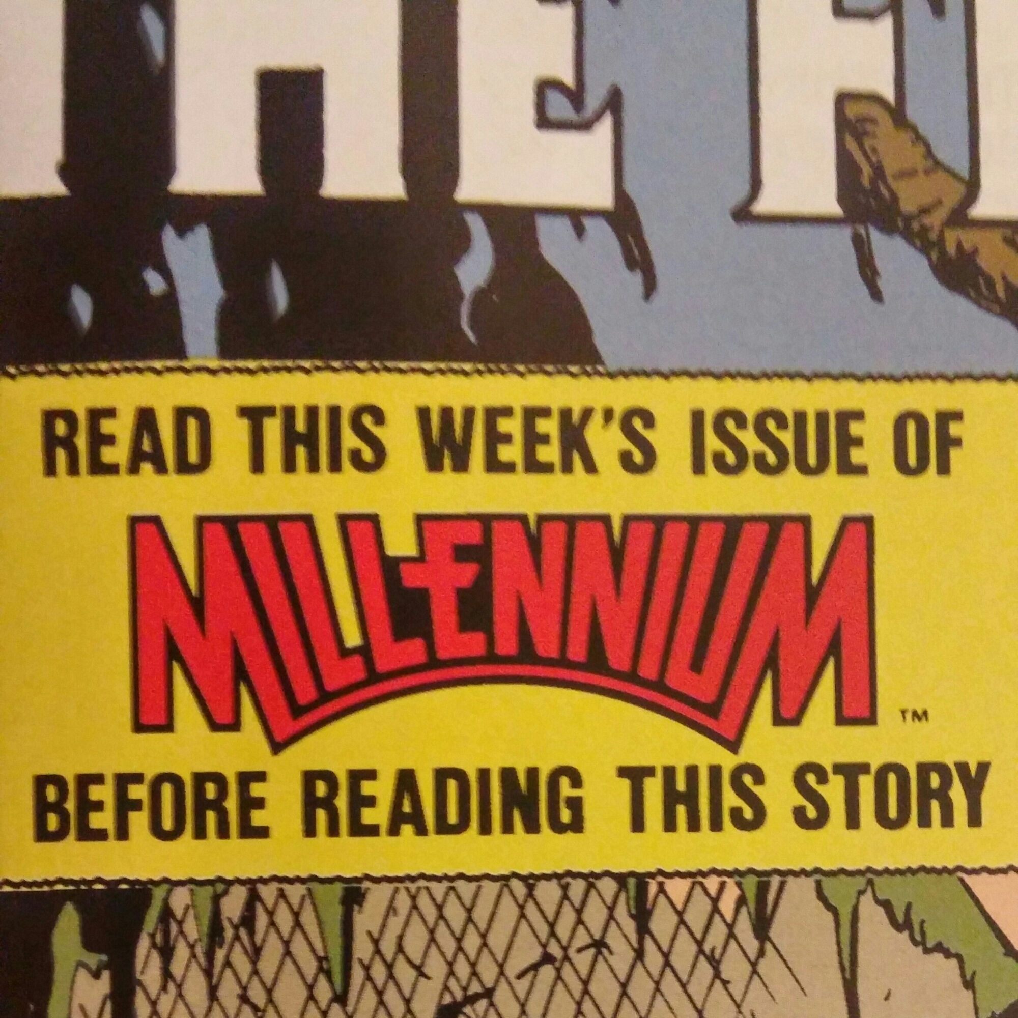 Page one, panel one, “READ THIS WEEK’S ISSUE OF MILLENNIUM BEFORE READING THIS STORY,” no issue number, and it’s not collected in the story. Flipping back to the cover apparently this is Millenium week 4.