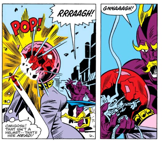 Hellcat, Valkyrie, and The Wasp are fighting Ruby and Dibbuk. The Wasp, thinking that Ruby is wearing a helmet, blasts Ruby in the head. Massive head trauma? A hero nearly killing someone? That’s a bit more of the ol’ “Everything is awful,” that we’ve come to expect. But things still need to get much more awful. No children were beaten senseless, no characters have been mistakenly shot down by Johnny Law.